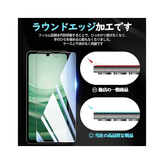 【対応機種】AQUOS Sense7 SH-53C SHG10 SH-M24 ガラスフィルム2枚 + カメラフィルム2枚。【注意】この電話の画面の端は湾曲しているため、保護フィルムのサイズが丁度良い場合、しっかりと貼り付けられず、白いエッジやシェルとの干渉などの問題があるため、保護フィルムは画面よりも小さいです。