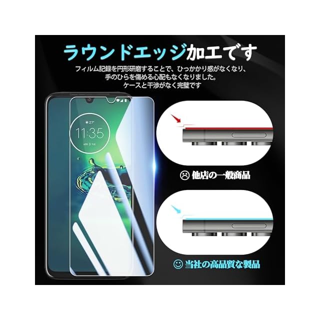 【対応機種】:Moto G8 Plus専用ガラスフィルム。【注意】この電話の画面の端は湾曲しているため、保護フィルムのサイズが丁度良い場合、しっかりと貼り付けられず、白いエッジやシェルとの干渉などの問題があるため、保護フィルムは画面よりも小さいです。