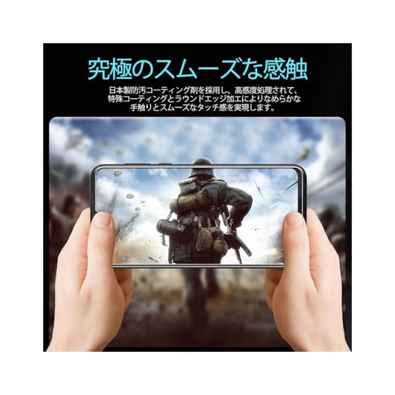 【指紋防止、高感度タッチ】ガラスフィルムには撥油コーティングが施されており、指紋や汚れなどに強くなめらかな操作感を実現、付着した汚れなどは簡単に拭きとれます。こちらは高耐久撥油コーティングが施され、つるつるな滑り感を実現!ゲームしても渋くなし!