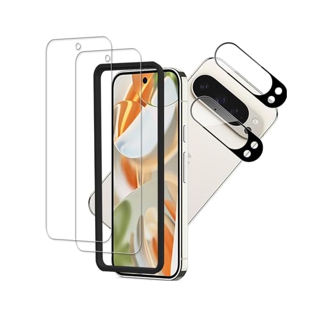 【対応機種】Google Pixel 9 Pro ガラスフィルム2枚 + pixel9 proカメラフィルム2枚。【注意】この電話の画面の端は湾曲しているため、保護フィルムのサイズが丁度良い場合、しっかりと貼り付けられず、白いエッジやシェルとの干渉などの問題があるため、保護フィルムは画面よりも小さいです。