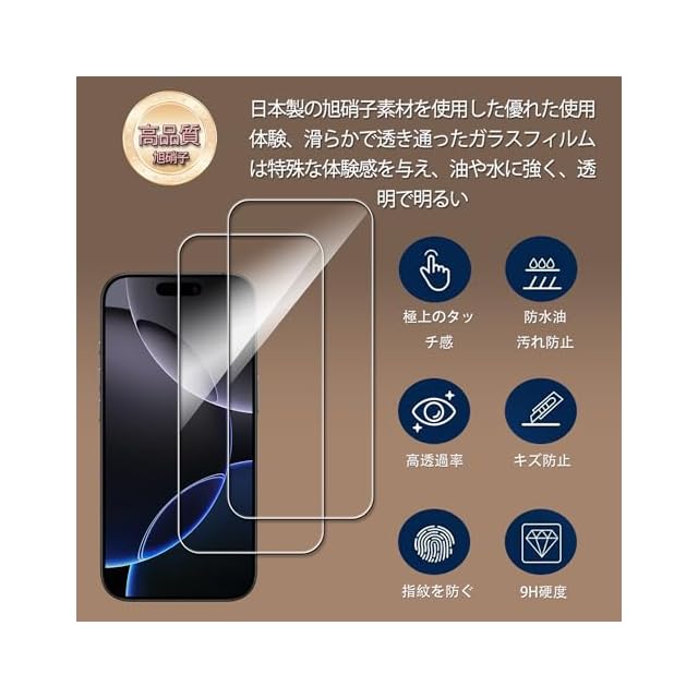 【9H硬度・日本製ガラス素材】日本旭硝子製ガラス素材採用 最上級強度のガラスを使用し表面硬度は9H。万が一スマホを落としてガラスが割れても、 ガラス破片が飛び散らないような安心設計。 飛散防止 、ガラス破片から守ります。
