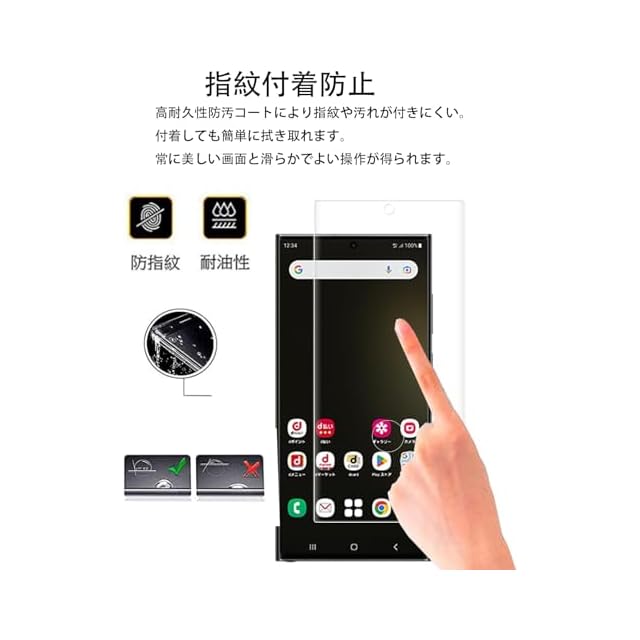 【指紋防止、高感度タッチ】ガラスフィルムには撥油コーティングが施されており、指紋や汚れなどに強くなめらかな操作感を実現、付着した汚れなどは簡単に拭きとれます。こちらは高耐久撥油コーティングが施され、つるつるな滑り感を実現!ゲームしても渋くなし!