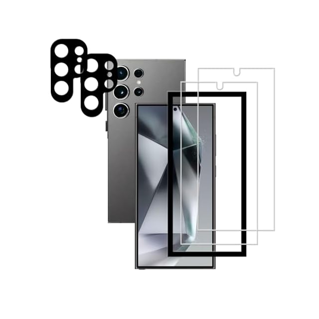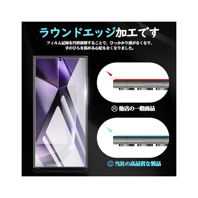 【対応機種】Galaxy S24 Ultra SC-52E SCG26 ガラスフィルム2枚 + カメラフィルム2枚。【注意】この電話の画面の端は湾曲しているため、保護フィルムのサイズが丁度良い場合、しっかりと貼り付けられず、白いエッジやシェルとの干渉などの問題があるため、保護フィルムは画面よりも小さいです。