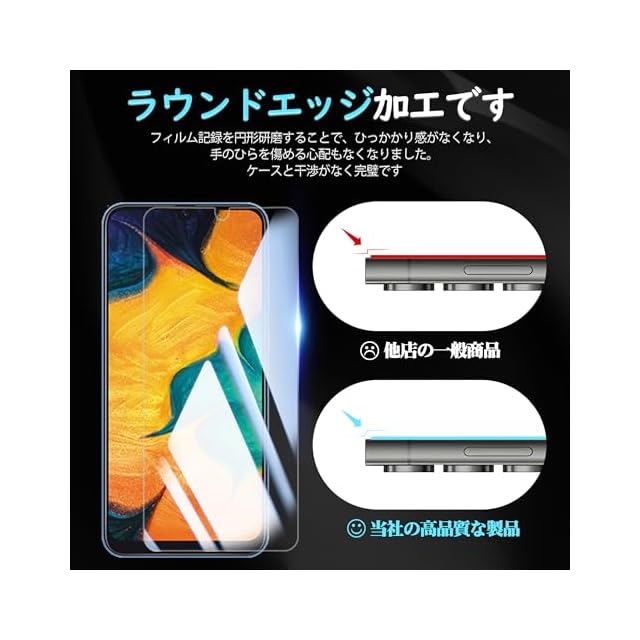 【対応機種】: Galaxy A30 SCV43 専用 ガラスフィルム。【注意】この電話の画面の端は湾曲しているため、保護フィルムのサイズが丁度良い場合、しっかりと貼り付けられず、白いエッジやシェルとの干渉などの問題があるため、保護フィルムは画面よりも小さいです。