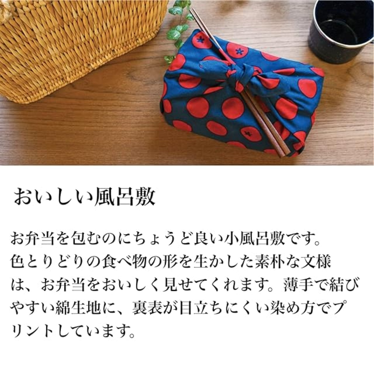 お弁当を包むのにちょうど良い小風呂敷です。色とりどりの食べ物の形を生かした素朴な文様は、お弁当をおいしく見せてくれます。薄手で結びやすい綿生地に、裏表が目立ちにくい染め方でプリントしています。
