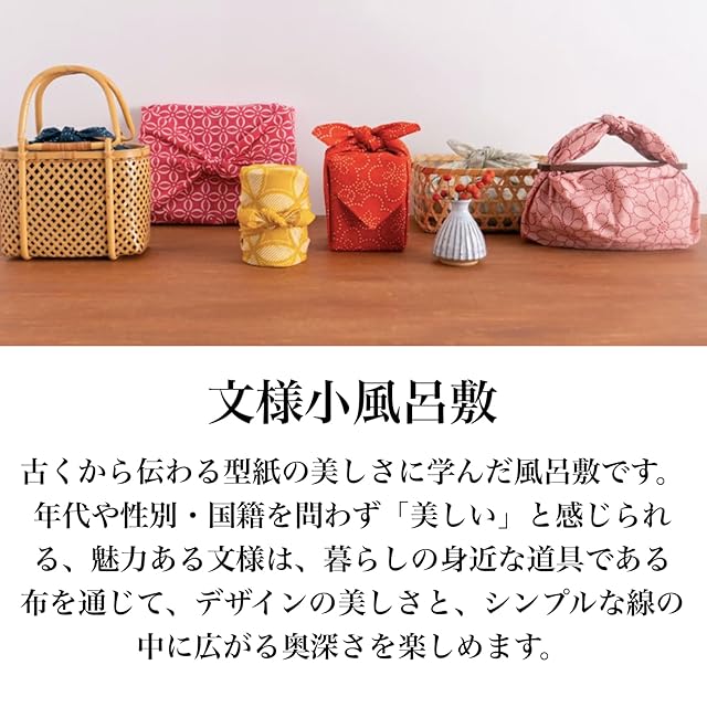 【文様小風呂敷】古くから伝わる型紙の美しさに学んだ風呂敷です。年代や性別・国籍を問わず「美しい」と感じられる、魅力ある文様は、暮らしの身近な道具である布を通じて、デザインの美しさと、シンプルな線の中に広がる奥深さを楽しめます。