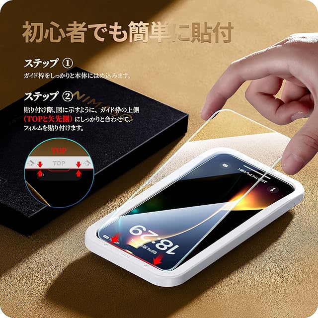 【貼付簡単】専用の貼り付けガイド枠が同梱されています。ガイド枠を利用することで、スマホ本体とフィルムがズレることなく、だれでも簡単にフィルムを貼ることが可能です。また、フィルム自体のシリコン自己吸着層により、位置を合わせて上から軽く置くだけで気泡が入ることなく簡単に装着できます。★ガイド枠下部が特殊な設計となっており、万が一貼付けに失敗しても、ガイド枠を外すことなくフィルムの貼り直しが可能で、ガイド枠の素材はABS(合成樹脂)ですので、スマホに傷をつけない素材でございます。ご安心してお使いください。