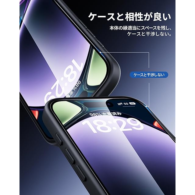「超透過率・ケースと干渉せず」超薄型で透過率は99.99%。驚くほど高い透明度を誇っており、画面の鮮明さや美しさを損なわずにいphone16 promax本来の美しい画面をお楽しみいただけます。2.5Dラウンドエッジ加工が施されており頑丈でありながら、装着後もiPhone16promaxのデザインを損なわず、ケースとの相性も抜群です。