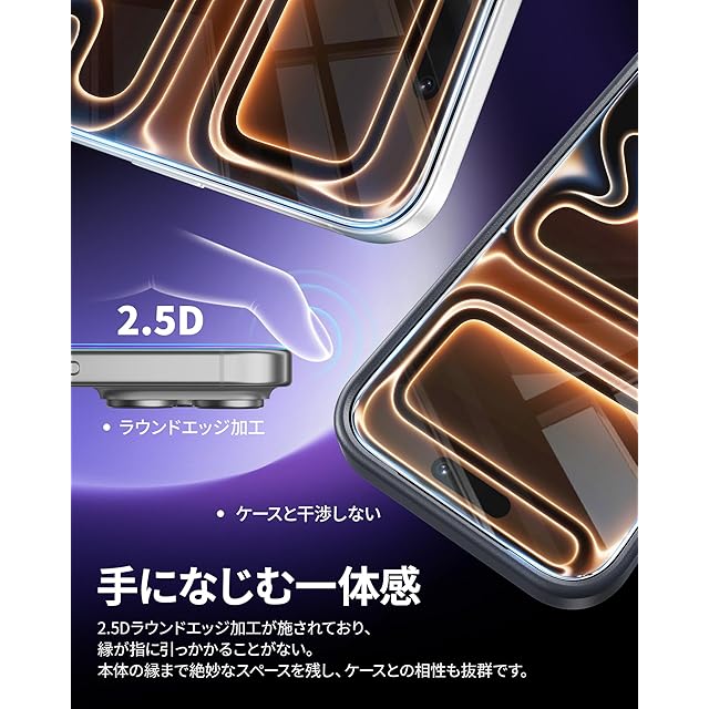 「2.5Dラウンドエッジ加工・ケースとの相性抜群」2.5Dラウンドエッジ加工が施されており、手に引っかかる感じがありません。本体の縁まで適度なスペースを残しており、装着後もスマホのデザインを損なわず、ケースとの相性も抜群です。
