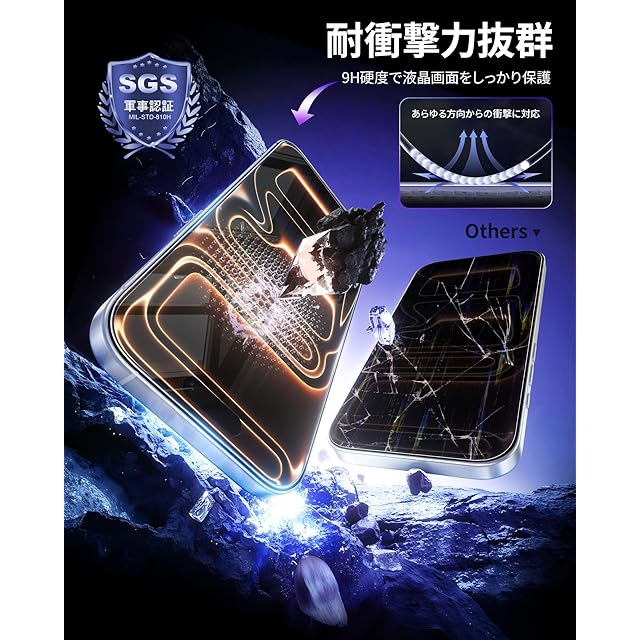 「耐衝撃・飛散防止」米軍規格「MIL-STD-810H」に準拠(認証番号:SZXEC23002005001)9H表面硬度ガラスを採用しており、外部からの衝撃を吸収し、画面へのダメージを最小限に抑えます。鞄やポケットのなかで鍵などの鋭いものにぶつかっても傷が付きにくいです。飛散防止加工により、万が一割れてもガラス破片が飛び散ることなく安心して使えます。