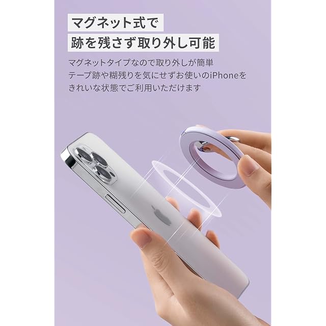 マグネット式で跡を残さず取り外し可能:マグネットタイプなので取り外しが簡単。テープ跡や糊残りを気にせずお使いのiPhoneをきれいな状態でご利用いただけます。またMagSafe対応ケースであればMagSafe対応iPhoneシリーズにケースをつけたままでも使用できます。※本製品はMagSafe非対応のケースには対応していません。ケースをお使いの場合は必ずMagSafe対応のケースをお使いください。