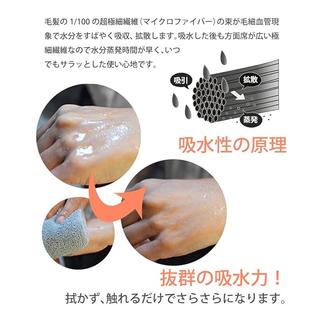 【拭かず、触れるだけでさらさらになる】毛髪の1/100の超極細繊維(マイクロファイバー)の束が毛細血管現象で水分をすばやく吸収、拡散します。拭かず、触れるだけでさらさらになります。