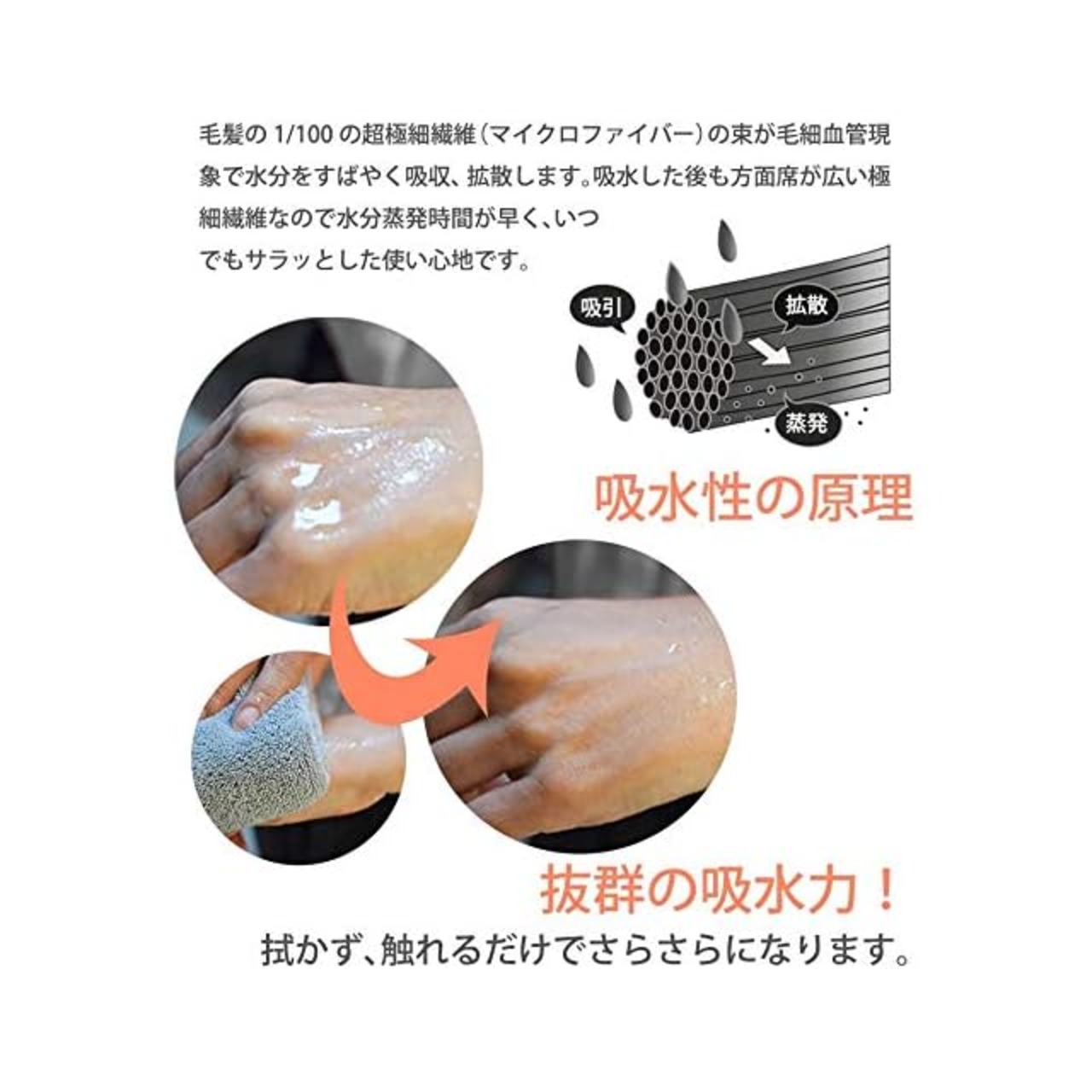【拭かず、触れるだけでさらさらになる】毛髪の1/100の超極細繊維(マイクロファイバー)の束が毛細血管現象で水分をすばやく吸収、拡散します。拭かず、触れるだけでさらさらになります。