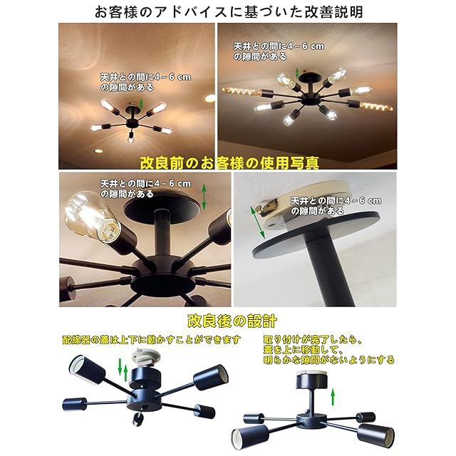 【簡単な取り付け】ペンダントライト8灯は引掛けシーリング式なので、取り付けは非常に便利で、工事不要、女性一人でも取り付けられます。★★★ご注意:感電の恐れがありますので、取付・取り外す前に必ず部屋の主電源のブレーキを下がってください!!!ご注意:傾斜のある天井、傾斜を合わせた舟底天井、凹凸のある天井ではご使用いただけません。必ず平らな天井に取り付けて下さい。