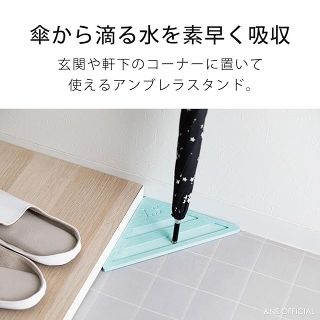 玄関や軒下のコーナーに置いて使えるアンブレラスタンド。本体の凹みが傘の先端にフィット、そのまま壁に立てかけるだけで省スペースな傘置き場に。いらない日は靴箱にすっとしまえるコンパクトサイズです。
