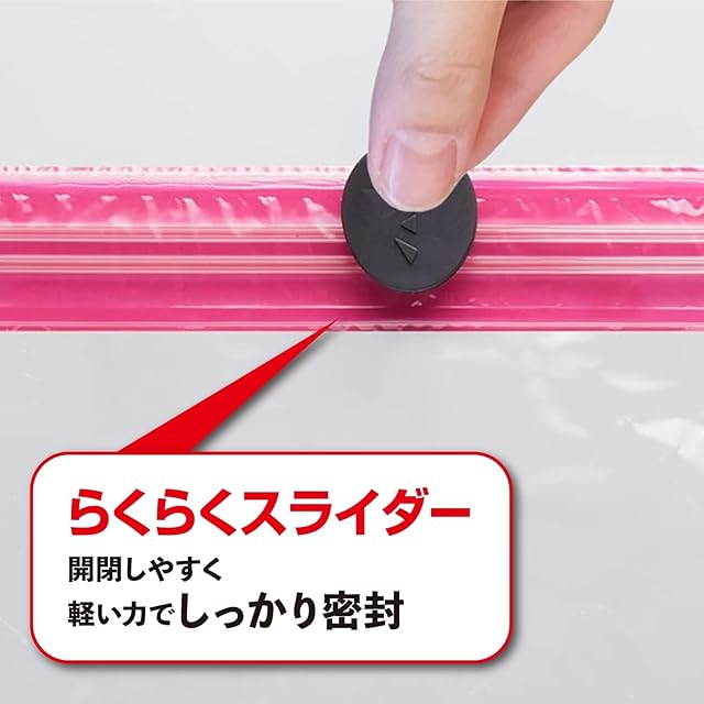 【誰でも簡単に閉じられる新スライダー】新設計スライダーで力を入れずにチャックを閉じることができ、指先が痛くならず、年配の方にもやさしい設計です。