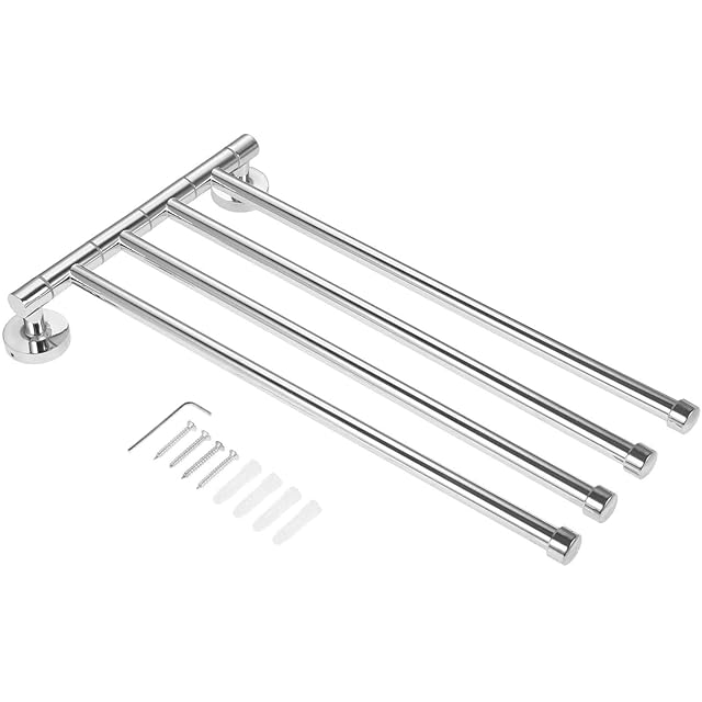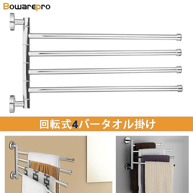仕様:<br> スタイル:4アーム回転タオルラック (長さ35cm)<br> カラー:シルバーステンレス<br> 材質:ステンレス鋼+亜鉛合金<br> 耐荷重:10kg以上<br> 取り付け方法: 接着剤でドリル不要。壁に取り付けてもネジで取り付けられます。<br> <br> 【使い易い、省スペース】:<br> · タオルバーが任意で180度回転でき、お好きな角度によってご使用ください。<br> · 寝室とクローゼットに取り付けると、服やタオル、洋服、細かい衣類などの収納に対してとても得意なものです 。<br> · コンパクトで回転可能な180°のデザインは、使用しないときにスペースをとらずに壁に平らに置くことができるため、スペースを効果的に節約できます。<br> <br> 【高品質素材】:<br> · 高品質ステンレス製で錆びにくいので、耐久性があります。<br> · 表面には塗料処理されて滑らかでタオルなどに傷つけない。<br> · 人間工学に基づいたデザインで、タオルが滑り落ちるのを防ぎます。<br> <br> パッケージ内容:<br> 1×スイングアームタオルラックグ<br>
