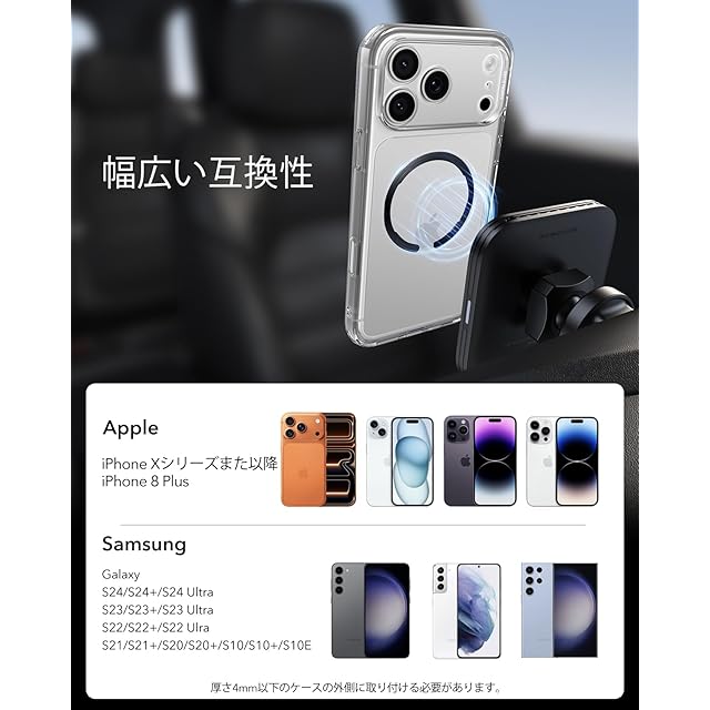 【MagSafeに対応させる】お使いの標準的なケースをMagSafe対応、簡単に速く磁気ワイヤレス充電できるようになります。指紋防止コーティングがついていないPCまたはTPUケースにのみ対応しています。MagSafeリングは金属製です。磁石ではありません。