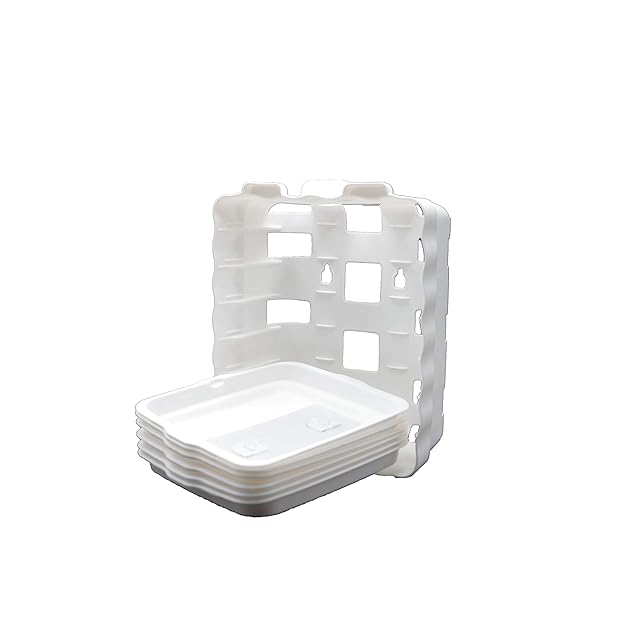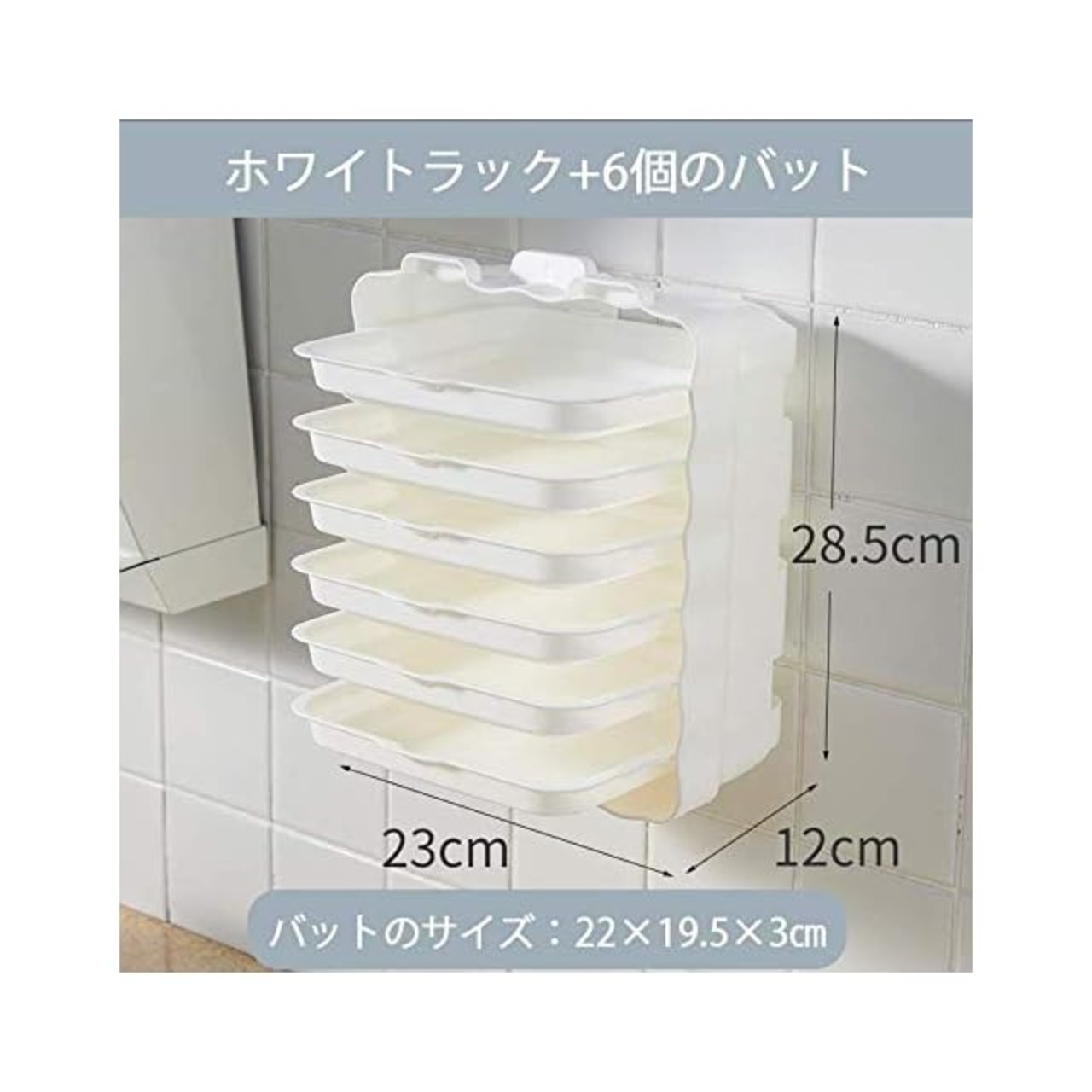 【商品仕様】セット内容:スマホホルダー付きラック1個、バット6個、繰り返し貼り付けフック1個、日本語説明書。ラックサイズ:幅23㎝、高さ28.5㎝、奥行12㎝。バットサイズ:幅22㎝、高さ3㎝、奥行19.5。素材:プラスチック、水洗い可能。
