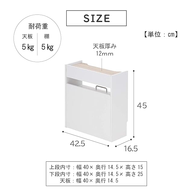 サイズ:42.5×16.5×45【㎝】 上段内寸:40×14.5×15【㎝】 下段内寸:40×14.5×25【㎝】 天板:40×14.5【㎝】 天板厚み:12mm 商品重量:4㎏