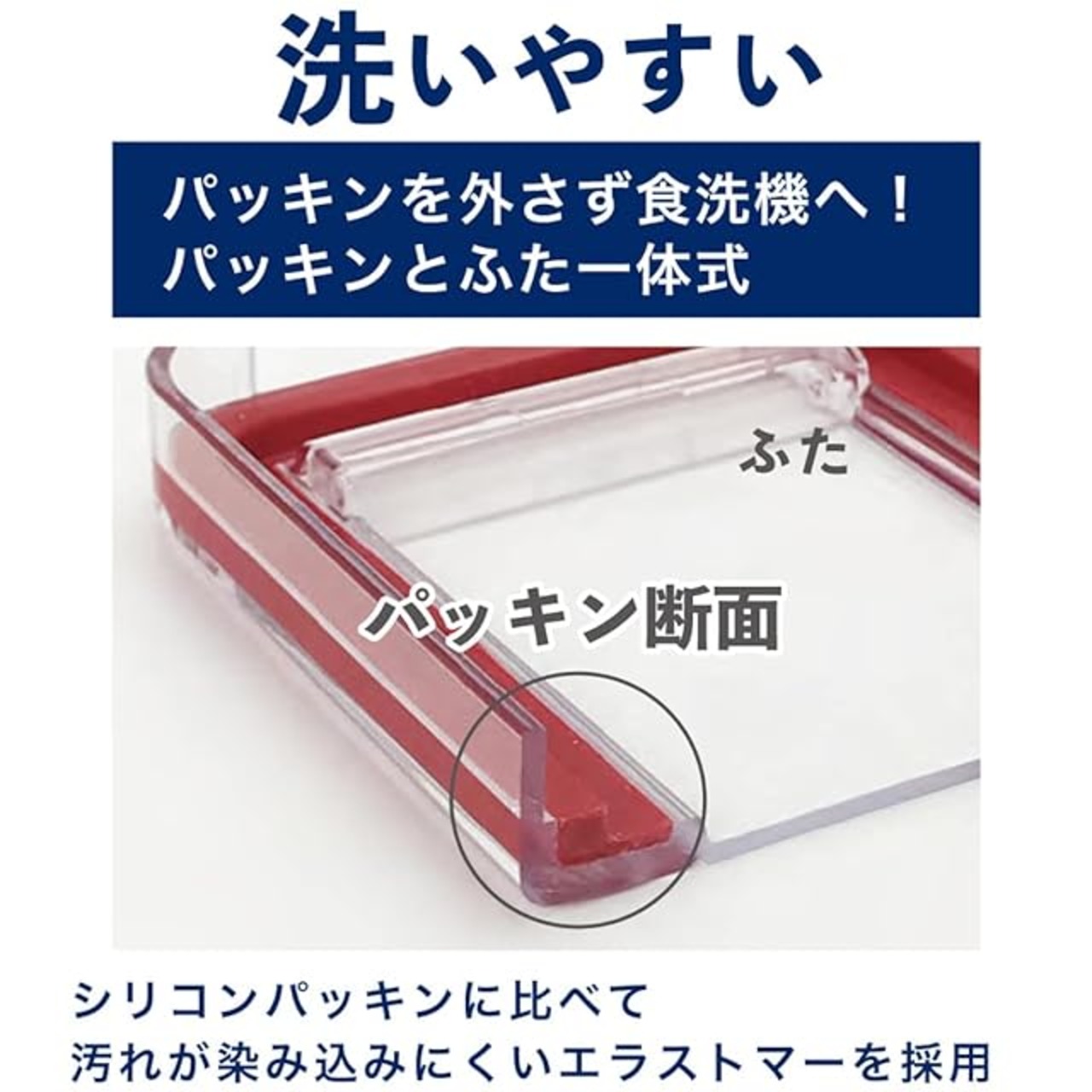 シリコンパッキンに比べて、汚れがしみこみにくいエラストマーを使用したパッキンをフタと一体化。