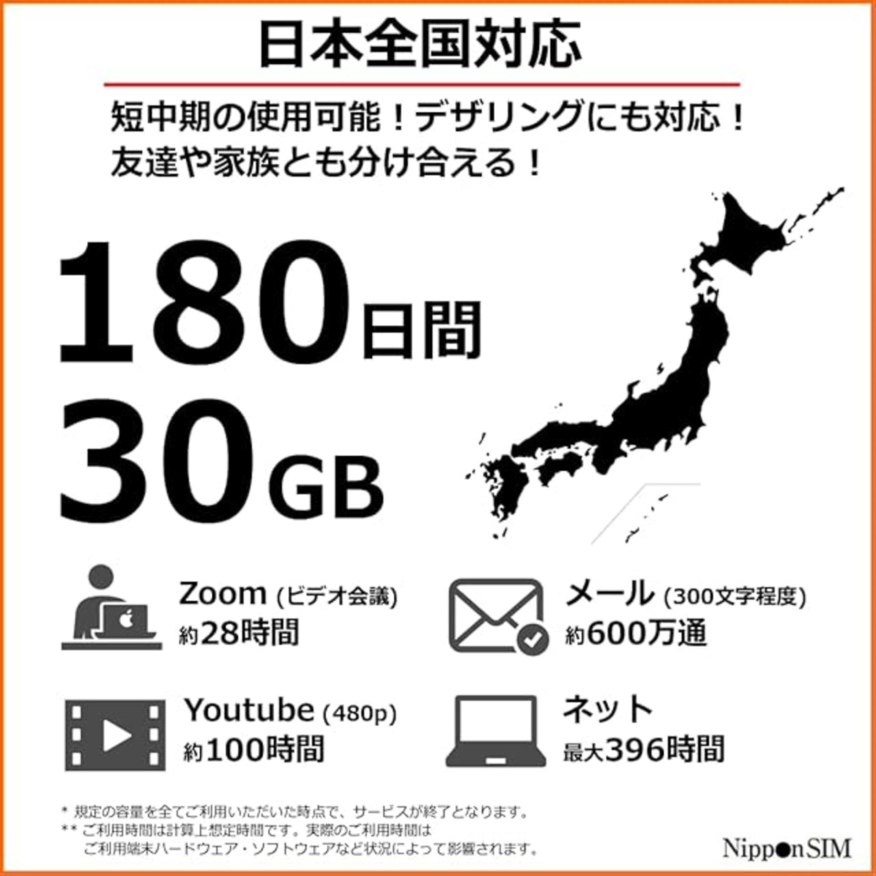 プリペイドsim 日本 simカード 180日間 30GB sim ドコモ通信網 docomo データ通信専用 4G LTE 3in1 (標準/マイクロ/ナノ) simフリー 端末のみ対応 多言語マニュアル付【Nippon SIM for Japan】