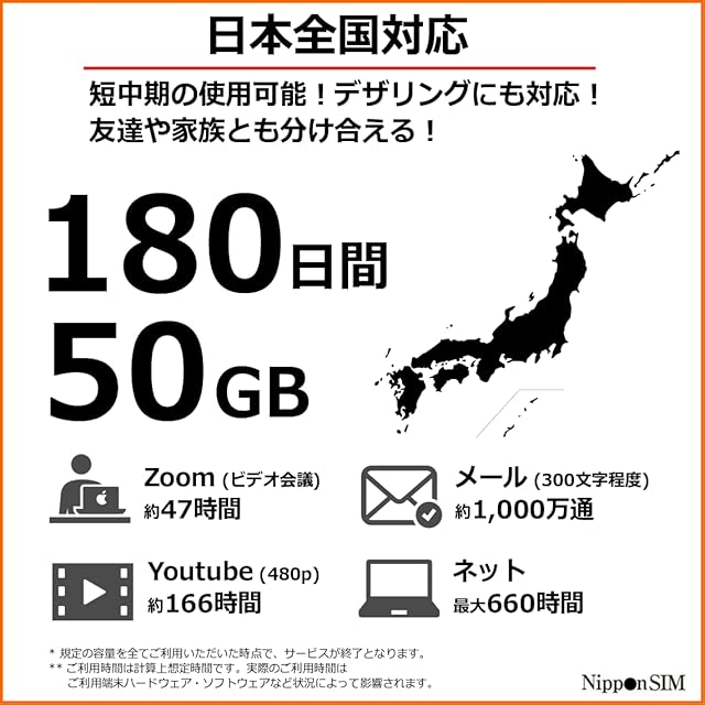 商品名:プリペイドsim 日本 simカード 180日間 50GB sim ドコモ通信網 docomo データ通信専用 4G LTE 3in1 (標準/マイクロ/ナノ) simフリー 端末のみ対応 多言語マニュアル付【Nippon SIM for Japan】
