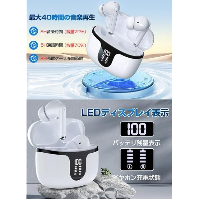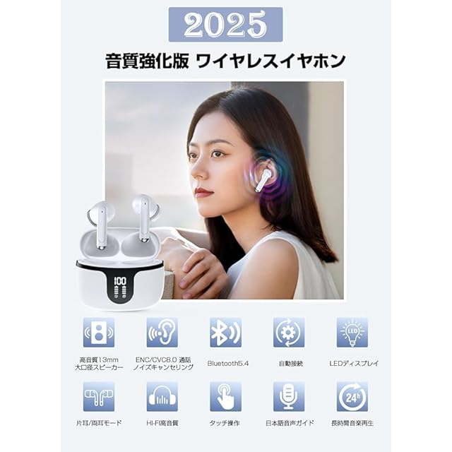商品名:2025【イヤホン Bluetooth5.4 音質強化型】 ワイヤレスイヤホン Bluetooth ブルートゥース イヤフォン カナル式 ENC通話ノイズキャンセリング LEDディスプレイ マイク付き 自動ペアリング 快適な装着感 最大40H音楽再生 ハンズフリー通話 タッチ操作 日語音声ガイド 重低音 片耳/両耳 スポーツ/iOS/iAndroid対応(Bright White)
