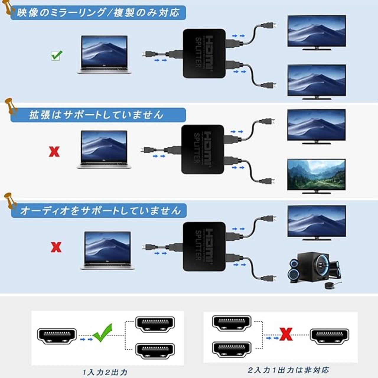 【パッケージ内容・品質】HDMI分配器は手のひらサイズで安定感のある平置き型設計を採⽤し、スペースも取らなくデュアルディスプレイを実現します。パッケージ内容:HDMI分配器本体×1、1.5M HDMI2.0ケーブル×1、USB電源ケーブル×1、日本語取扱説明書×1。12ヶ月の日本国内安心が付いているので、ご質問があった場合、又は万が一商品に不具合が生じた場合があるなら、カスタマーサービスまでご連絡を頂けると商品交換や返金対応いたします。いつでもお気軽にお問い合わせください。必ず最善を尽くし、サービスを対応致します。