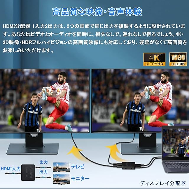 【2025改良型・分配器】HDMI分配器 1入力2出力は、2つの画面で同じ出力を複製するように設計されています。4K HDMI分配器 同時出力は、1つのHDMIソース(コンピューターなど)を2つの出力に接続できます (そのような:テレビ、プロジェクター、モニター)、そして両方の出力は同じページを表示します。2 つの LED インジケータにより、どのポートがアクティブであるかが LED ライトで簡単にわかります。あなたはビデオとオーディオを同時に、損失なしで、遅れなしで得るでしょう。注意:ミラーモードだけ対応し、2つの異なる画面は出力できないので、拡張モードは非対応。