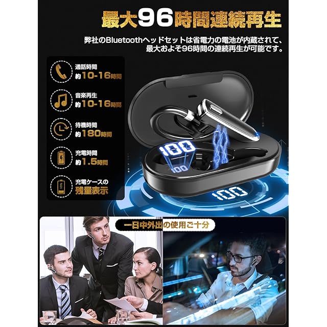 【最大96時間連続再生&大容量充電ケース付き&LEDバッテリー残量表示】テレワークの普及に伴って、必要性を増してきたweb会議。時には長丁場となるweb会議を、ストレスなく進めていきたい方が多いです。お客様の声を集めて、弊社のBluetoothヘッドセットは省電力の電池が内蔵されて、最大およそ96時間の連続再生が可能です。収納ケースが付いていて、長時間通話していても電量不足になる心配がありません。LEDランプが付くので、バッテリー残量を数字で一目で確認出来ます。Type Cケーブルで約1.5時間でフル充電になり、本体連続再生は10-16時間可能です。また充電ケースと併用すれば合計で約96時間の長時間使用が可能です。(ご注意:再生時間は充電時間、音量調整、再生内容、使用環境、個人使用習慣、接続デバイスなどによって異なる場合があります。)
