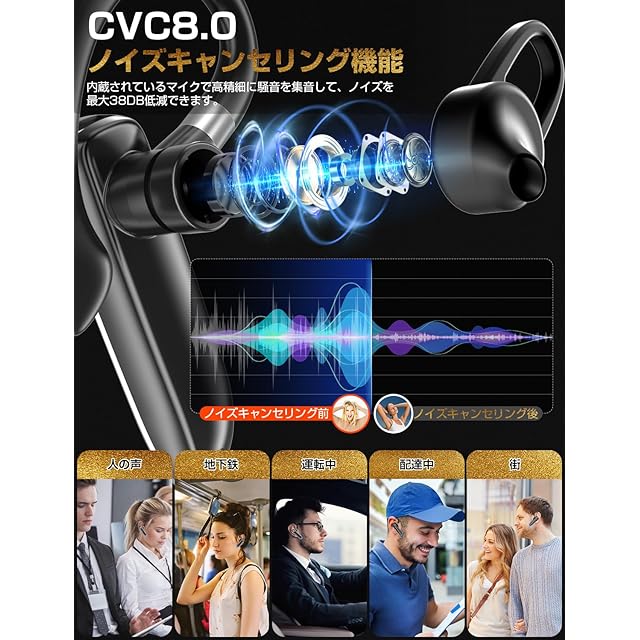 ⚡【業界先端Bluetooth 5.3&CVC 8.0ノイズキャンセリング】業界最先端Bluetooth 5.3チップを搭載し、ぶつぶつと途切れることもなく高速で安定した通話品質を実現して、「音飛び」や「音切れ」を大幅に改善することができます。片耳型なので、両耳を塞がず、通話しながらも周囲の状況を把握できます。さらにマイク部にはCVC8.0ノイズキャンセリング機能も付いているためこちらの声もクリアな状態で届けます。相手側のノイズもかなり低減して鮮明に聞き取ることが可能です。音質向上のためのデジタル信号処理から、安定したBluetooth接続のためのアンテナの位置など、細部までこだわって設計されています。また満員電車やバスなどで音楽を聴くのに利用する際もケーブルを気にすることなく利用できるため、混雑した状況でも快適に音楽を楽しめます。