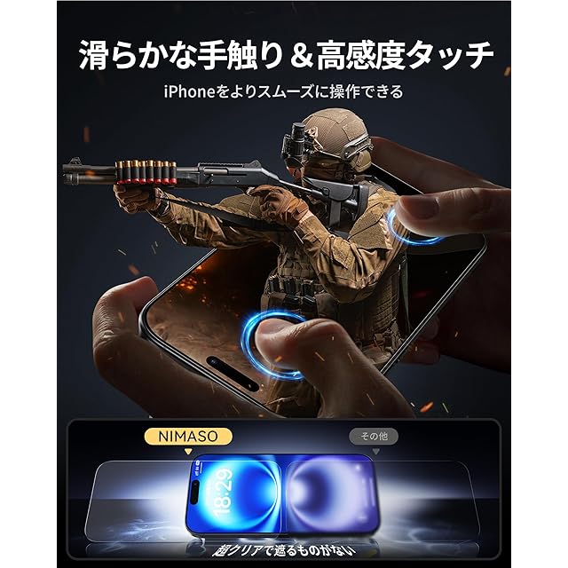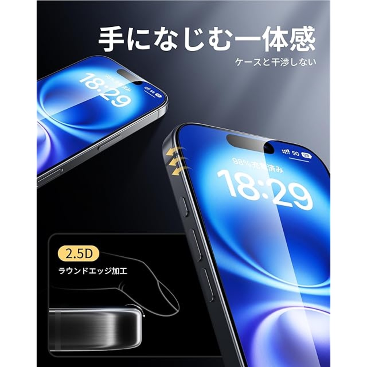 「指紋防止・滑らかな触り心地」本製品は撥水撥油のAF(Anti-Fingerprint)コーティング加工とスムーズタッチ加工により、指紋や汚れがつきにくく、油分や水分が強く付着した汚れや指紋がついても、拭き取るだけで綺麗になれます。また、使用時の手触りも滑らかで、毎日のドラマ視聴やオフィス仕事、ゲームなどの邪魔になりません。常に美しいiPhone16 の画面をお楽しみいただけます。