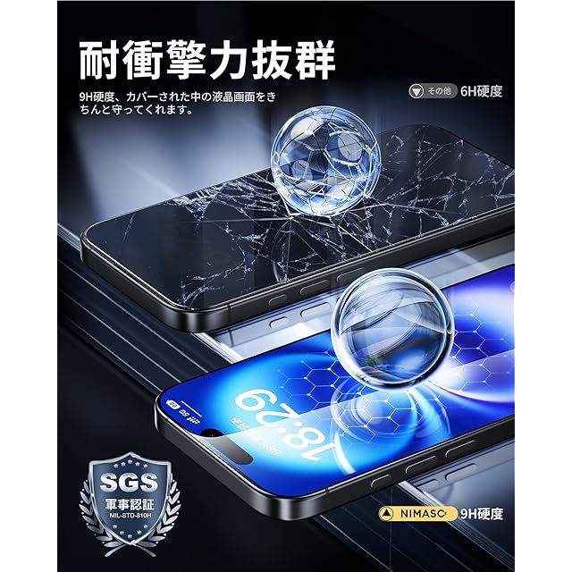 「9H硬度・飛散防止」米軍規格「MIL-STD-810H」に準拠(認証番号:SZXEC23002005001)。9H硬度のガラスを採用。小刀や鍵などの鋭いものにぶつかっても傷が付きにくく、あいふぉん16をしっかり保護します。飛散防止加工により、万一割れてもガラス破片が飛び散ることなく安心です。