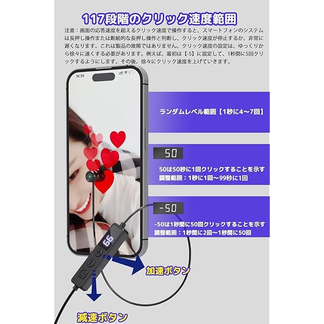 【117のクリック周波数レンジ】117のクリック周波数レンジを持っています。この周波数レンジは市販の同類品より2~3倍にアップし、99秒に1回~1秒に50回のクリック頻度をカバーしています。