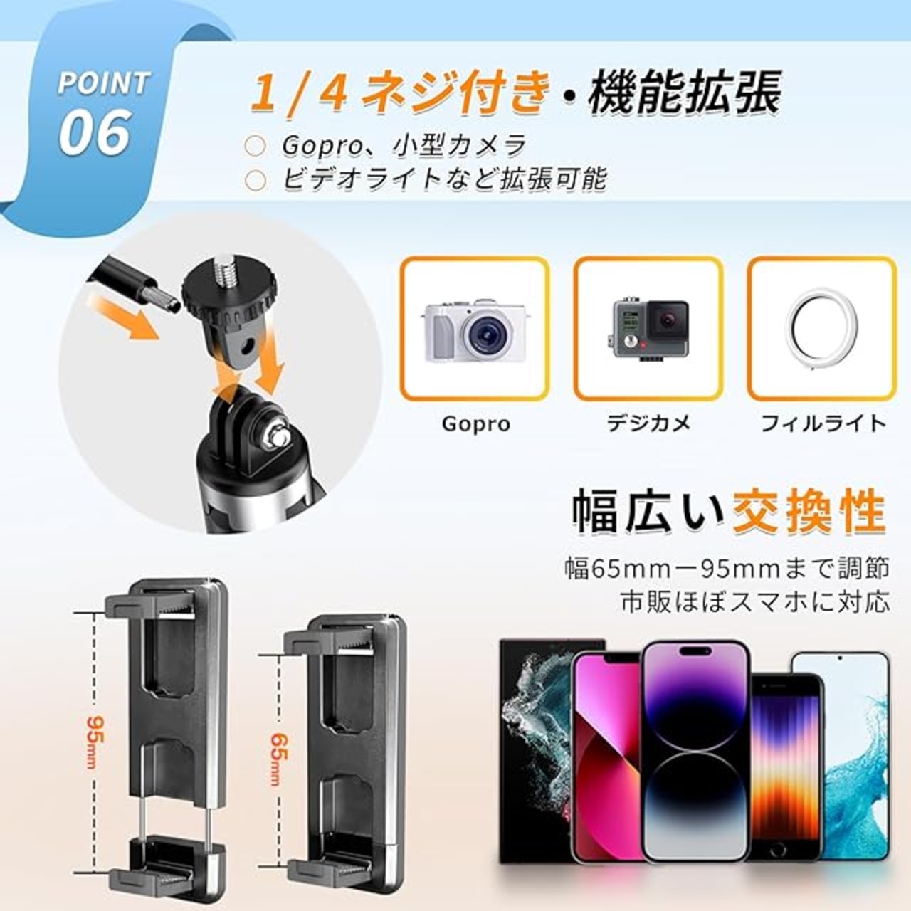 【幅広い交換性 iPhone/Android対応 1/4ネジ付き 】幅6cm~9.5cmまで Android& Iphoneのスマホに対応さます、ホルダーはスマホを傷つけにくく、しっかりとホールドできるシリコン素材のスマホホルダー。友達や家族とシェアしたり、今後の機種変更でも安心してお使い頂けます。固定ホルダーには傷・落下防止ゴム付きなので、しっかりスマホを固定出来ます。標準の1/4ネジ、ビデオカメラ、一眼レフなど装着できます。GoPro(アクションカメラ)、デジカメラにも対応可能です。