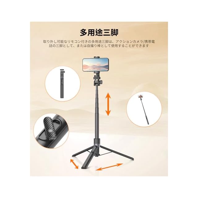様々なシーンに対応:自撮り棒に三脚を内蔵するタイプで、自撮りだけでなく、風景写真、生放送、大人数のグループ写真、旅行、登山、運動会など様々なシーンに対応できます。収納一体式なのでバッグにも収納しやすく、旅先でも持ち運びやすい。