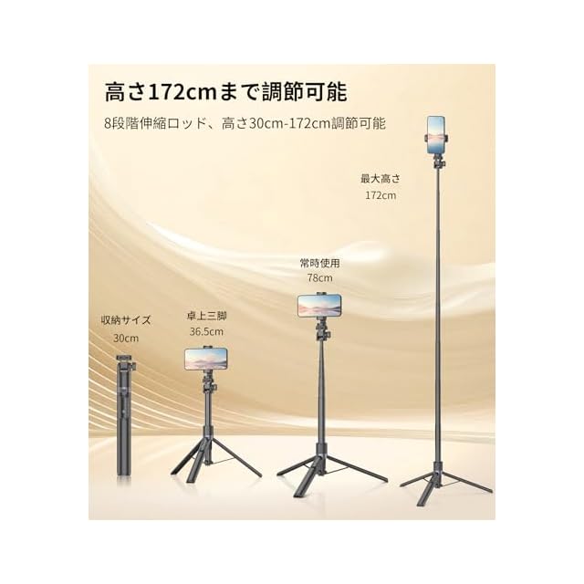 三脚/一脚兼用&最長172㎝まで伸縮可能:スマホ三脚と自撮り棒を一体化され、底部のボタンを押すと便利に三脚に展開し、コンパクトで様々なシーンに適応します。折りたたんだ時の長さは30cm、重量311g(ホルダー含む)、最長172cmまで伸びることができます。持ち運びに便利なだけでなく、背の高い人にも苦労せず撮影できます。(伸縮ロッドを伸ばすにはある程度の力が必要です。)