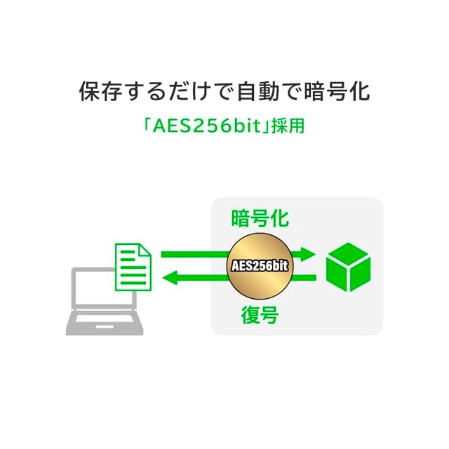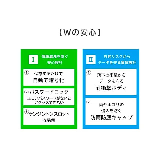 【[Wの安心]I 情報漏洩を防ぐ安心設計】保存するデータは、すべて自動で暗号化され、簡単に情報漏洩対策ができます。保存したデータにアクセスするためには、パスワードによる認証が必要となります。「ハードウェア自動暗号化」「パスワードロック」「ケンジントンスロット」で大切なデータを強力に守ります。