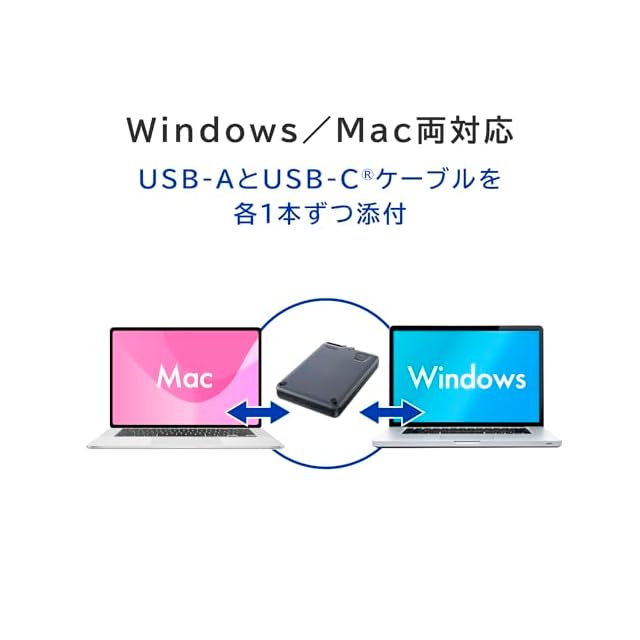 【Windows/Mac両対応!USB-C(R)ケーブルも添付】Windows/Mac両方に対応しています。USB-AケーブルとUSB-Cケーブルを各1本ずつ搭載しておりますので、幅広い機種でお使いいただけます。Windowsの場合、管理者権限だけでなく、ユーザー権限でご利用いただくことが可能です。※初期化する際は、管理者権限が必要です。