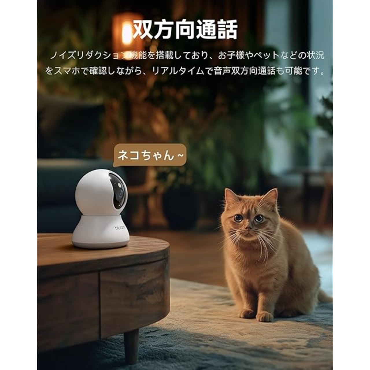 【PTZ首振り機能・ 双方向会話】水平方向360°、垂直方向110°のPTZ機能が搭載しており、アプリでネットワークカメラの向きを遠隔操作でき、360°自由に回転させて、どこからでもご家族やペットを見守ることができます。4倍デジタルズーム機能で気になる部分を拡大して詳細に確認することもできます。さらに、アプリでリアルタイムの双方向音声通話が可能です。ペットの様子を見守る際や、介護が必要な高齢者のケア、オフィス内の監視など、様々なシーンで活躍します。