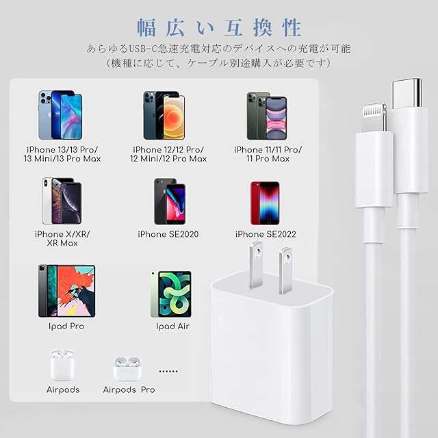 【20W PD 急速充電器】当社のUSB-C充電器はPower Delivery3.0の充電技術を採用して、純正の充電アダプター3倍早く急速充電できます。テスト済み:13 へ僅か30分で60%までに充電できます。Quick Charge 4.0/3.0/2.0急速充電と互換性があります。「ご注意」本製品はUSB-C&iPhoneケーブルとのセットです。【PSE認証済で安心・安全】当社のiPhone充電器はPSE認証を取得し、厳格な品質管理を通じて、更に過熱、過充電、過放電および回路ショート防止など給電保護機能搭載しており、iPhone/iPadデバイスに自動的に必要な電流に適合し、迅速かつ安定してデバイスを充電できます。【アイフォン充電ケーブル 2m付き】PD充電器セットは2m アイフォン用充電ケーブルを同梱しています高品質の4芯銅線を採用し、効率的に充電時間を節約します。最も耐久性優れるPVCで作られて、数千回以上の折り曲げテストに合格しました。USB-C to iPhone充電ケーブルは自動チップ認識機能を備え、iOSバージョンで完全にサポートされます。【コンパクト&携帯便利】このタイプC急速充電器は省スペースに配慮されたコンパクト設計(4.8*4.2*2.6cm)、電源タップに挿しても他のコンセントに干渉しません。カバンやポケットに簡単に収納でき、持ち運びには便利です。ちょっとしたお出かけや海外旅行まで幅広くご活用いただけます。【幅広い互換性】あらゆるUSB-C急速充電対応のデバイスへの充電が可能。iPhone 14/14 pro/14 pro max/ 13/13 Mini/13 Pro/13 Pro Max/ 12/12 Mini/12 Pro/12 Pro Max、iPhone SE、iPhone 11/11 Pro/11 Pro Max、iPhone XS/XS Max /XR/X、iPad/AirPods Proとの互換性があります。