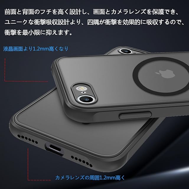 【適用型番】このスマホケースはiPhone SE2022/SE2020/8/7専用にデザインされており、精密な技術とカッティング処理が施されています。ケースを装着したままでも電源ボタン、音量ボタン、接続ポートなどを自由に操作でき、取り付けや取り外しも簡単です。精巧で軽量なデザインで、控えめでエレガントな印象を与え、長時間持っていても疲れません。【半透明美学・エレガントな高級感】このスマホケースはマットな半透明デザインを採用しており、iPhone本来の美しさをうっすらと引き立てます。表面は滑らかで心地よい手触りを持ち、指紋や汚れを効果的に防ぎます。さまざまなシーンで快適にご使用いただけます。 [すべての素材が環境にやさしい]【米軍MIL規格・高耐衝撃性】このスマホケースは、世界的に有名な米国軍事規格を取得しており、高弾性の衝撃吸収バンパーと頑丈なポリカーボネート素材を組み合わせた設計で、優れたバランスを実現しています。優れた耐衝撃性能を備え、あらゆる方向からあなたのスマホをしっかりと保護します。【レンズ・画面まで細部保護】本ケースは段差設計を採用し、画面縁とカメラ周りをわずかに高く仕上げることで、外部接触によるキズを効果的に防止。背面には滑り止め加工を施し、長時間の使用でも疲れにくい快適なグリップ感を実現。ビジネスからアウトドアまで、様々なシーンで快適にご使用いただけます。【カスタマーサービス】私たちは、お客様が私たちの存在理由であると確信しており、常にユーザー体験を最優先に考え、製品の品質向上に努めております。これが私たちのブランド理念です。したがって、このiPhoneケースを安心してご購入いただけます。万が一、製品に品質の問題が発生した場合は、商品到着後30日以内にご連絡いただければ、24時間対応のオンラインサービスを提供いたします。お客様の状況に応じて、交換または返金をさせていただきます。