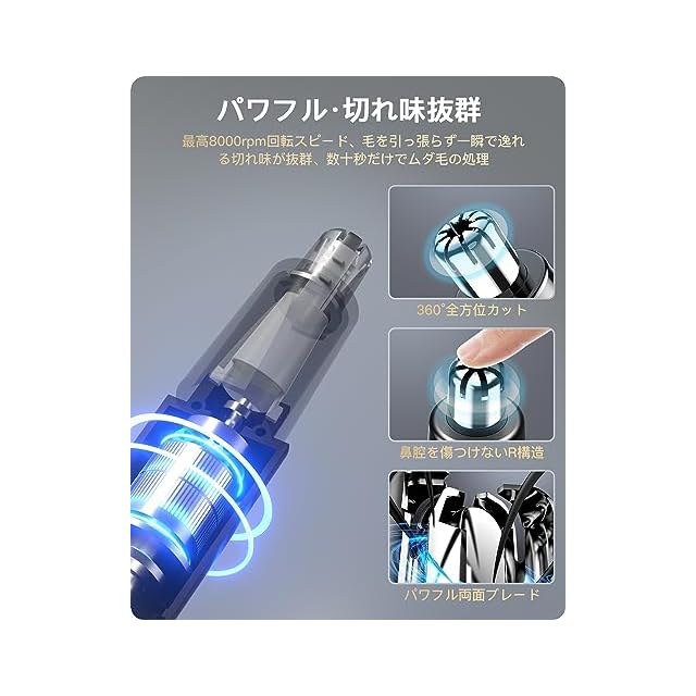 【一台3役の多機能電動鼻毛カッター メンズ】鼻毛カッター本体のヘッドを簡単に交換することにより、エチケットカッター、眉毛シェーバー、耳毛カッター、ヒゲシェーバーとしてご利用いただけます。ヘッドはひねると外れる仕様で簡単に交換できます。したがっていつでもトリミングできます。はな毛カッター 男性は高速回転モーターとダブルブレードが内蔵された人間工学に基づいた立体設計。安全性が高く、無駄毛を素早くカットでき、鼻腔にもびったりとフィットし、奥まできれいにカットできます。鼻毛 カッターのワンタッチ設計は使いやすい、男女兼用、いつでもどこでも最も自信のある一面を見せることができます。