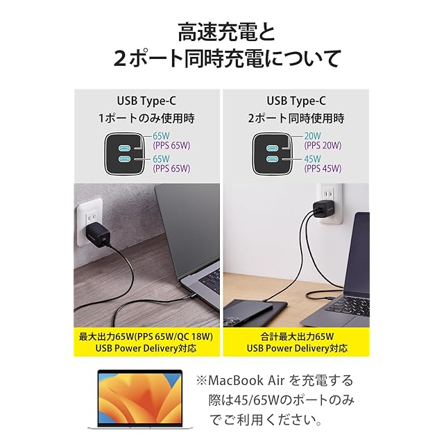 出力端子が2ポートあるので、iPhoneなどのスマートフォンとWindowsなどのノートパソコンを2台同時充電できます。※2ポート同時出力時は合計最大65Wとなります。