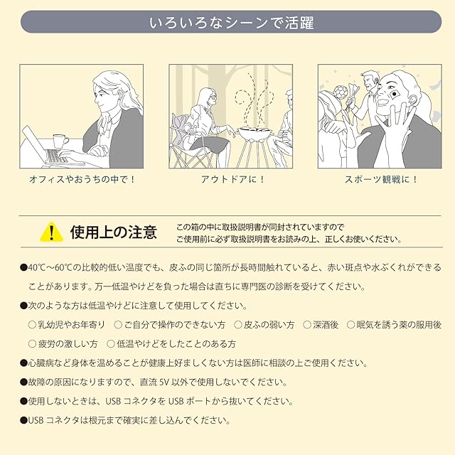 【様々なシーンで使えるUSB暖房】ACアダプターやモバイルバッテリーなど、USB電源があれば、いつでもどこでも使用可能です。オフィスやテレワーク時の寒さ対策はもちろん、キャンプやスポーツ観戦などアウトドアでも使用できて便利なアイテムです。