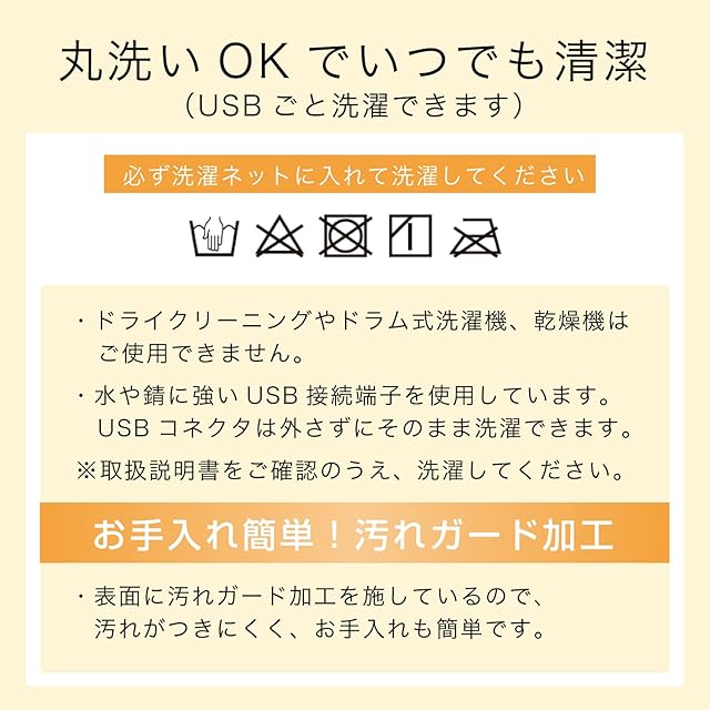 【丸ごと洗える】通常のUSBひざ掛けは温まる部分を外さないと洗えませんが、このUSBひざ掛けは洗濯ネットに入れることで、洗濯機で丸洗いすることができます。※ドライクリーニングやドラム式洗濯機、乾燥機はご使用できません。