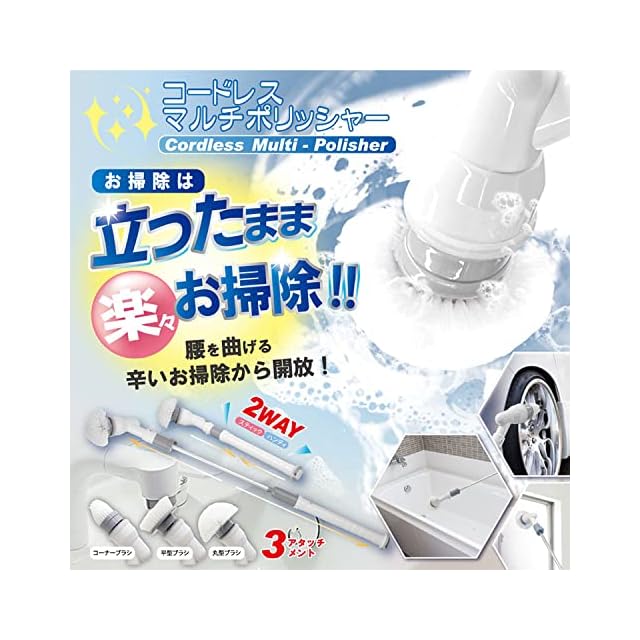 ヒロコーポレーション HDL-PLS002 コードレスマルチポリッシャー 電動お掃除ブラシ お風呂 バス 車 ポリッシャー 掃除電動ブラシ ハンディ スティック 2way 3種類のアタッチメント ブラシ 腰を曲げずに掃除 年末の大掃除に ホワイト 110㎝