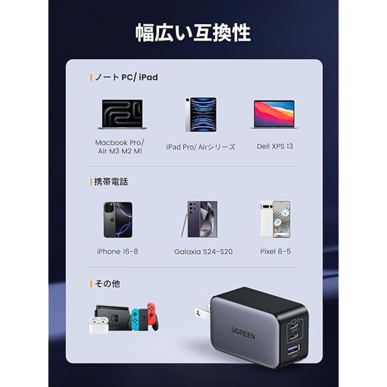 ▶【UGREEN 65W 充電器のコピー品にご注意ください!】最近、市場でUGREEN 充電器のコピー品が、流通していることが確認されています。これらの偽造品は、品質や安全性がされておらず、万が一ご購入・ご利用された場合、性能が期待通りでないだけでなく、安全上の問題を引き起こす可能性があります。当社では正規品以外の購入を強くお勧めしておらず、コピー品を購入したことによるいかなるトラブルや損害についても責任を負いかねます。皆様のご理解とご協力をよろしくお願い申し上げます。