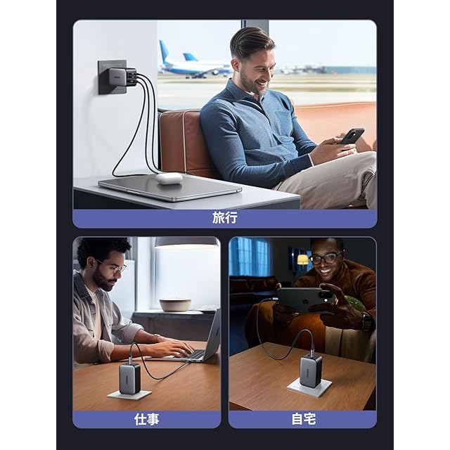 ▶【3台同時充電OK!】弊社のNexode 急速充電器はType-C×2とUSB-A×1の4つの充電ポートを搭載しています。さらに、コンセントのスペースを有効活用し、ケーブルの散らかりも減少。デスクや生活空間をスッキリと整えます。家庭でもオフィスでも、このタイプc充電器は全会一致で最適な選択としておすすめされる!(単ポートも65W対応!)